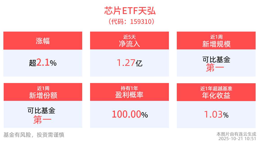 拉长时间看,截至10月20日,芯片ETF天弘(159310)近1周新增规模位居可比基金第一。芯片ETF天弘(159310)近1周份额增长1500.00万份,实现显著增长,新增份额位居可比基金第一。