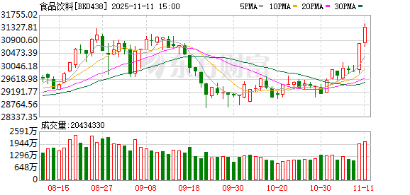 午后,在食品饮料板块的带动下,大消费概念逆势走强,朱老六30cm涨停,欢乐家20cm涨停,三元股份、保龄宝、中粮糖业均封涨停,一致魔芋、三元生物、巴比食品等多股跟涨。