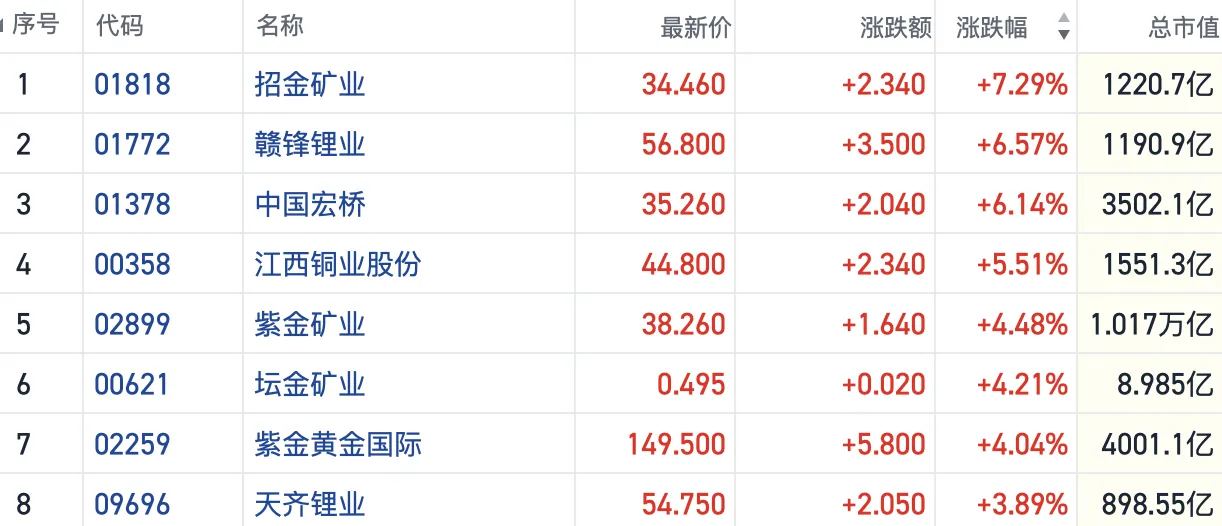 受益国内碳酸锂、金、银、铜等商品期货主力合约继续走高带动,今日黄金有色板块再度集体上攻。截至收盘,招金矿业(01818.HK)、赣锋锂业(01772.HK)、中国宏桥(01378.HK)分别涨7.29%、6.57%和6.14%。