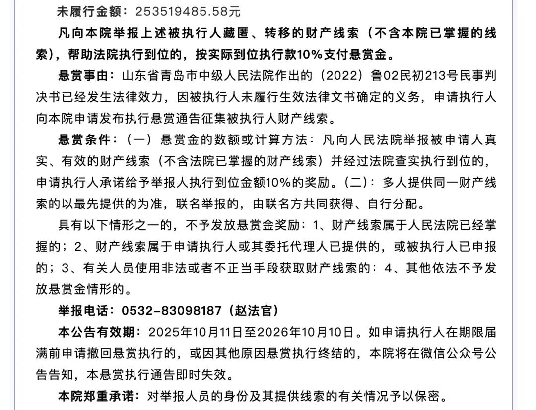 根据青岛中院的通告,该院作出的(2022)鲁02民初213号民事判决书已经发生法律效力,但因被执行人未履行生效法律文书确定的义务,未履行金额高达2.535亿元。