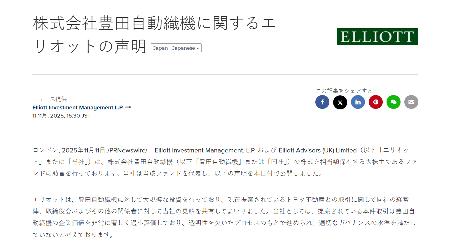 丰田自动织机周二回应称,公司正持续与包括埃利奥特在内的股东进行沟通。